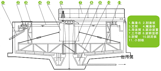 固定在旋轉(zhuǎn)豎架上的刮臂在驅(qū)動裝置帶動下,繞池中心軸線旋轉(zhuǎn),將沉積在池底的污泥由刮泥板刮集至池中心集泥坑,同時,液面上的浮渣向隨導(dǎo)流筒旋轉(zhuǎn)的撇渣板和周邊浮渣擋板形成的漸縮區(qū)域內(nèi)集中,直至其封閉邊—刮渣擺臂。當(dāng)擺臂抵達(dá)集渣斗時,由擺臂上的刮渣板刮集至集渣斗排出池外。